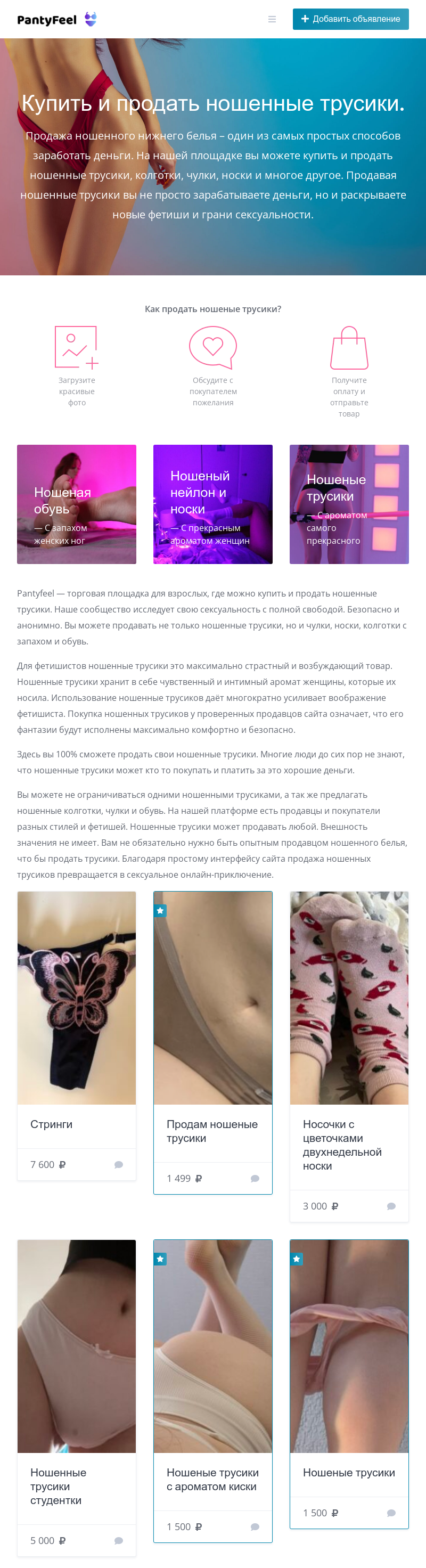 Всё очень просто — достаточно пройти быструю регистрацию на сайте и создать своё первое объявление. Для успешных продаж мы настоятельно рекомендуем воспользоваться премиум услугами Pantyfeel.com: